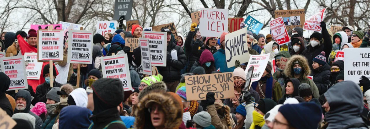 Una capes més àmplia de treballadors i joves s’ha mobilitzat en manifestacions i concentracions diàries des del 7 de gener. Fins ara, la manifestació més gran va tenir lloc el 10 de gener, quan desenes de milers de persones van protestar sota el clima gèlid de Minnesota. Els companys de l’RCA de les Ciutats Bessones van informar del següent: