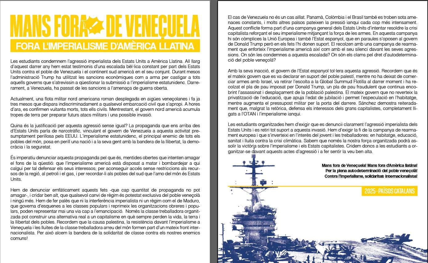 Les estudiants organitzades hem d’exigir que es denuncii clarament l’agressió imperialista dels Estats Units i es retiri tot suport a aquesta invasió. Hem d’exigir la fi de la campanya de rearmament europea i que s’inverteixi en l’interès del jovent i les treballadores: en habitatge, educació, sanitat i lluita contra la crisi climàtica. Sabem que només la nostra força organitzada podrà assolir la victòria sobre l’imperialisme i els Estats capitalistes. Cridem doncs a les estudiants a organitzar-se davant aquests actes d’agressió i a fer sentir la veu ben alta.